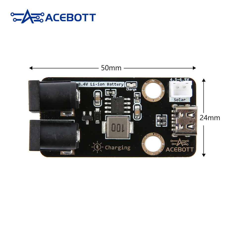 Charging module is a project for the Internet of Things and renewable energy, providing safe and efficient embedded solar power management modules for makers and application engineers. The charging module has the function of solar energy charging, which can use solar energy to charge lithium batteries under certain light conditions, and has the function of power protection, providing efficient and reliable power management for various solar energy projects. Application reference: solar car and robot, solar intelligent environment monitoring system, small solar street lamp. Click to explore: Charging Module Product Doc Parameter Specification Parameter Value/Description Operating voltage 4.5V~6.5V Battery type available for charging 7.4V double section series lithium ion battery charging current 900mA Max Charging cut-off voltage 8.4V 1% Maximum static power consumption <1 mA Operating temperature -40 C~+85 C Size 5.0cm*2.4cm